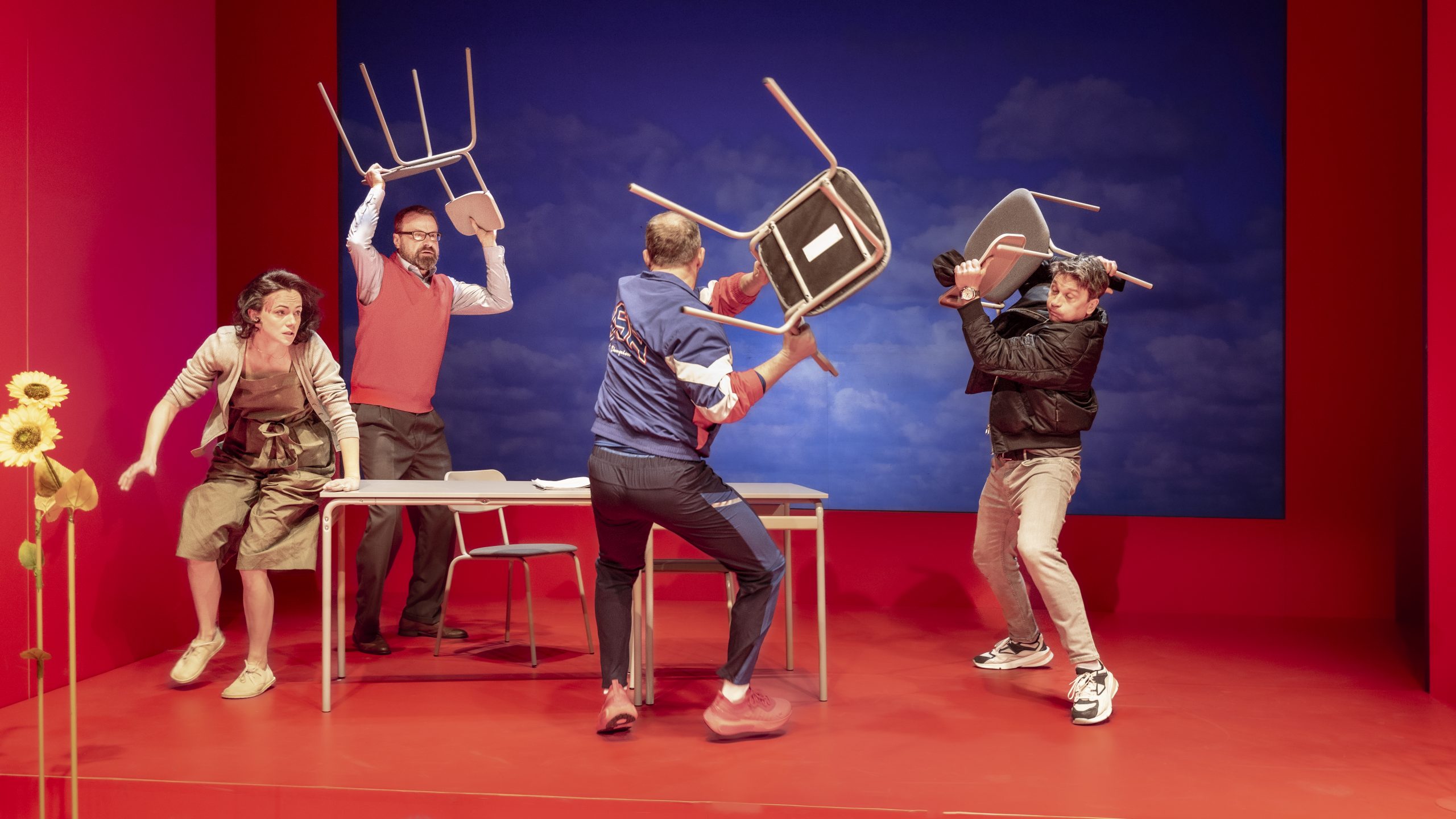 Hercům v rolích i „rolích“ se daří ve svěžím temporytmu vytvářet na jevišti vztahy mezi jednotlivými figurami, také ty s lehce erotickým podtónem, a to jak vztahy uprostřed připravované hry, tak vztahy – zase s jiným typem sympatií i antipatií – v divadelnickém kolektivu. Charisma figur protagonisté elegantně prostřídávají. Atmosféra kolem přípravy premiéry začíná houstnout, v televizi vystoupí též konzervativní pretendent na funkci ředitele Klenčka (z filmového záznamu Jan Grygar), který horlí proti samotnému titulu i tématu hry, kontruje tím, že publikum by si zasloužilo nějakou pěknou „pověst, událost nebo pohádku z Moravy“. Situace se stále výrazněji zamotává, ředitel je odvolán, na jeho místo nastupuje – zdá se, že s chutí – asertivní dramaturgyně, další komické momenty vnáší do Glaserovy inscenace postava herce Břéti (Bedřich Výtisk), který z vlastní iniciativy obohacuje multikulturní balábile chystané premiéry přeexponovanou postavou Číňana. Premiéru provází skandál, který způsobí agresivní vstup „pobouřených“ diváků na jeviště (jde o kratičkou filmovou rekonstrukci počátku kulturní pohromy, která v roce 2018 blokovala brněnské hostování slovinských divadelníků s Frljičovou inscenací Naše násilí, vaše násilí). Po všech naznačených peripetiích je „zklidňujícím“ ředitelem Moravského národního divadla (tak se kulturní instituce v komedii nazývá) jmenován aktivní staromilec Klenčka.